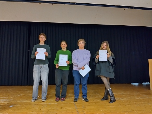 In der Altersgruppe II traten Till (Q1) und Jeva (Q2) gegen zwei Debattierende der OS Findorff an. Da es nur vier Teilnehmer*innen gab, debattierten alle vier zweimal. Auch in dieser Altersgruppe gab es einen Sieg für das AvHG: neben Ella von der OS Findorff kam auch Till in die nächste Runde.